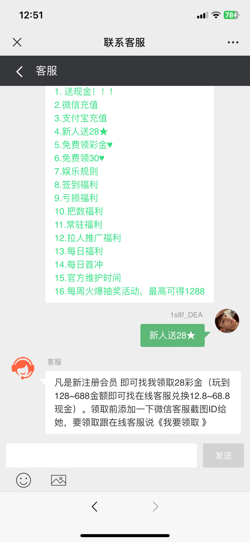 新注册会员 领取28彩金(玩到128~688金额即可找在线客服兑换12.8~68.8现金)。领取前添加一下微信客服截图ID给她,要领取跟在线客服说《我要领取 》