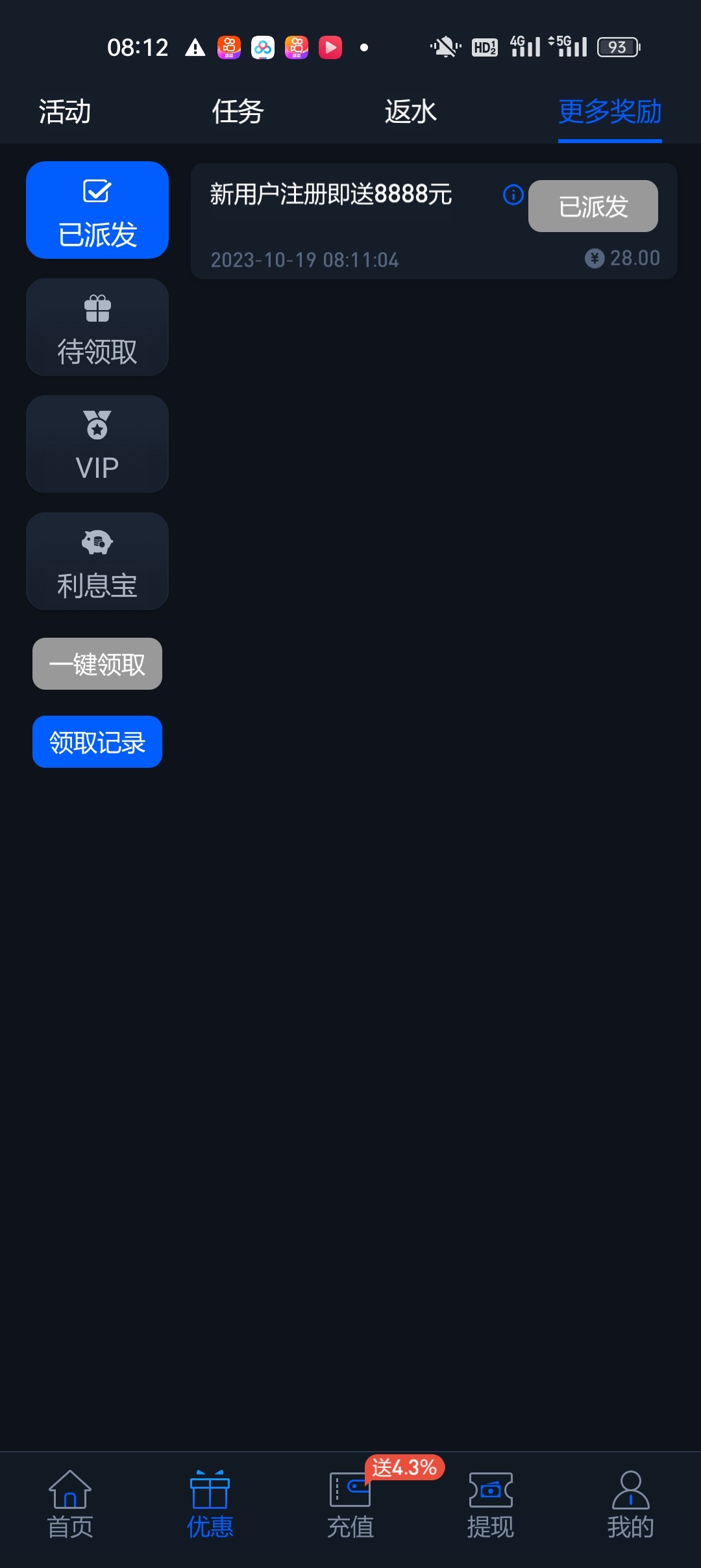下载app,注册登录,实名认证,验证手机号,绑定no钱包,优惠里申请新人28-8888彩金,都有。