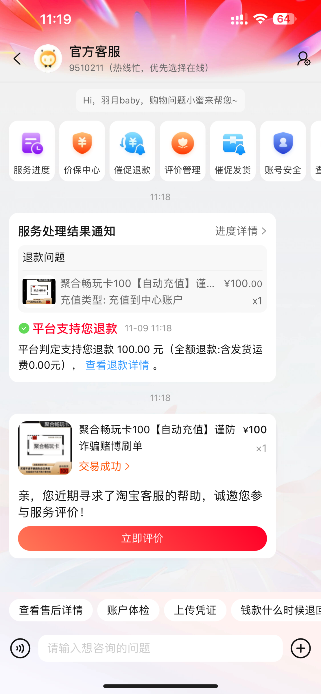 关于淘宝卡退款问题