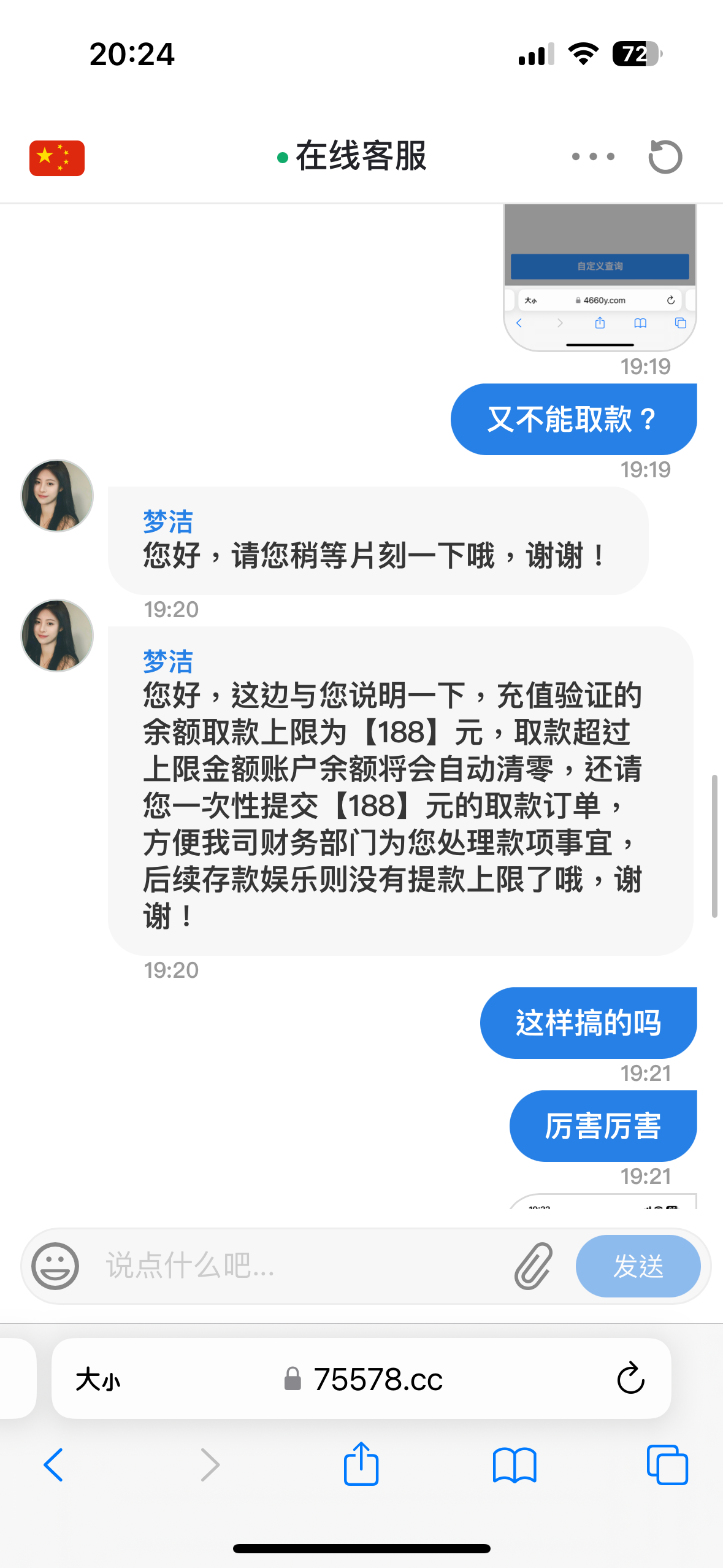 一开始签到几块钱打上去五百左右,然后提现退回,然后说只能出108,剩下人工下掉了,提现过一会又退回,要求充一百,冲完打完流水之后,又变成只能提118,又人工下掉了,一百本金,我打了差不多四个小时,就赢他18块钱,我日他妈妈