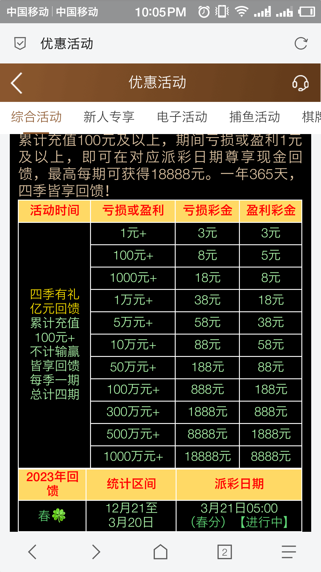 明天3月21号凌晨5点有回馈四季春分彩金,自己领取,活动图如下,我两个号一起回馈23