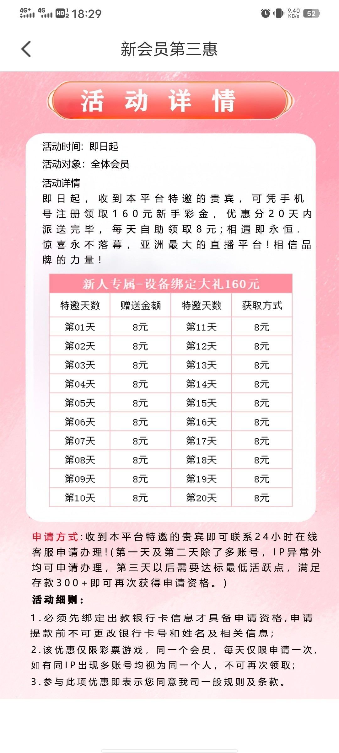 ,只能领第一天,最低100提,禁止充值否则后果自负