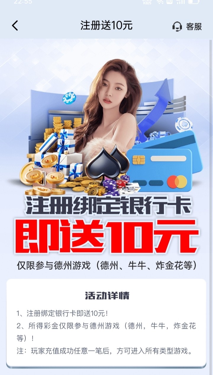 新用户注册绑卡秒送10/仅限德州牛牛和炸金花。都是真实玩家 斗智斗勇 敢于亮剑才能赢 德州扑克锦标赛也可以免费报名最高可拿5000。