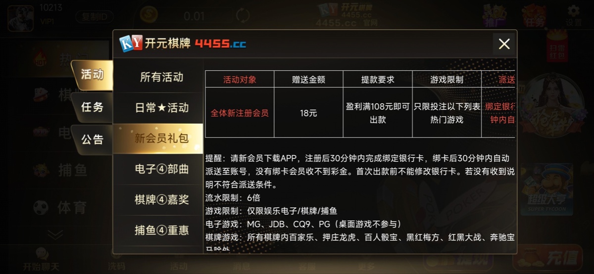 新用户注册下载完善资料一小时内送18,不送无视。限制电子/棋牌/捕鱼,最低108提。之前这个平台特邀注册送45联系送两三天,不知道现在还有这个活动不,自己试一下。