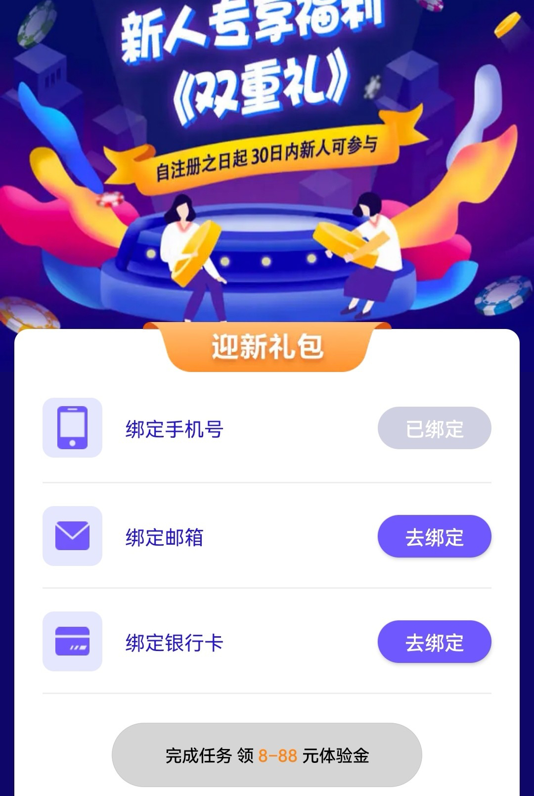 点击首页新人有礼,完善资料送8~88,亲测送了12,禁止充值