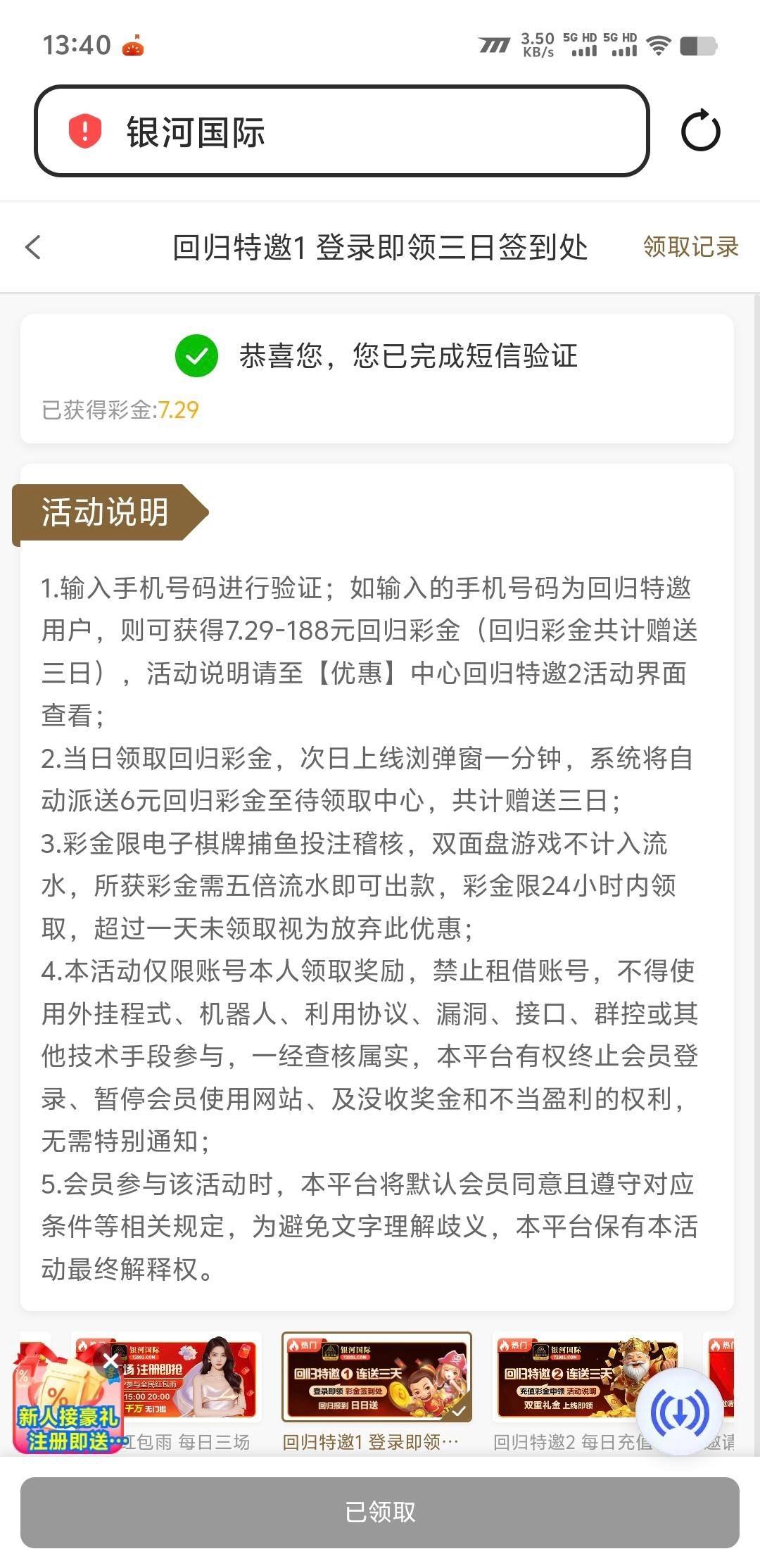 银河72991回归送3天没充值过,之前这个应该都有特邀,注册过得去领回归连送3天网址72291.com