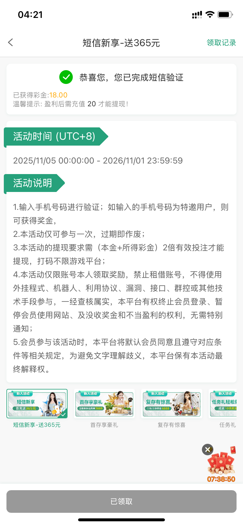 我是下载app 短信验证彩金 用常用的号码试试吧