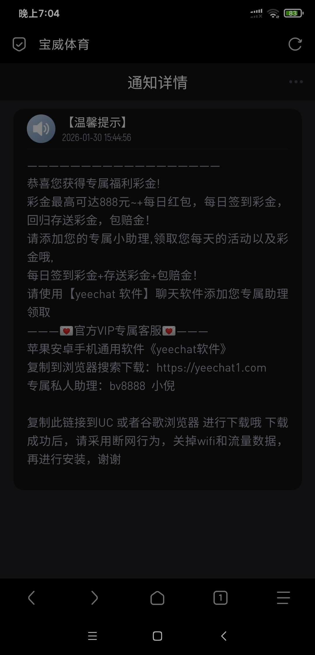 有号的下个yeechat加客服bv8888去碰瓷,没号的注册完了等站内信,过年这会儿经常送,我v0一个月领了两次18了