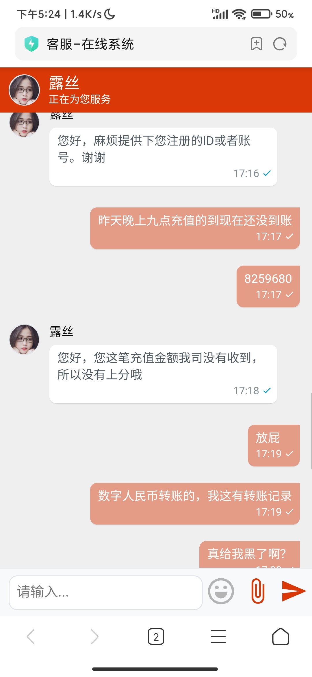 昨晚九点多用数字rmb充值的200,等了二十个小时不到账,期间一直联系客服,客服让一直等着,现在直接黑了。有转账记录,兄弟们千万别去这玩了。垃圾黑台。v5了都,黑200,服气。